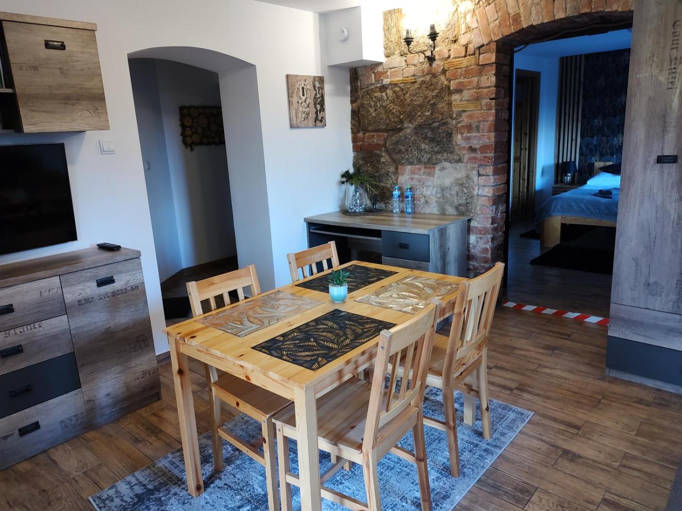 Apartament z widokiem na góry. The sauna is the standout feature of this apartment. Boasting a private entrance, this apartment comes with 1 living room, 1 separate bedroom and 1 bathroom with a shower and a hairdryer. The fully equipped kitchen has a stovetop, a refrigerator, kitchenware and a microwave. Featuring a terrace with garden views, this apartment also features a tea and coffee maker and a flat-screen TV. The unit has 2 beds. Apartament - 4 osobowy. Powierzchnia pokoju ok.: 42 mkw.